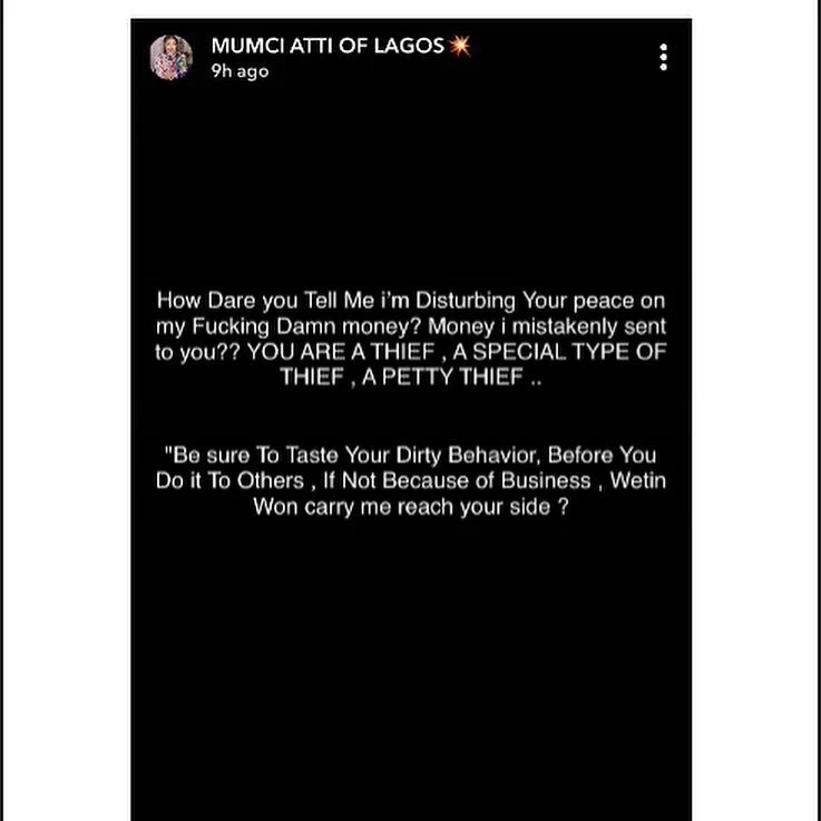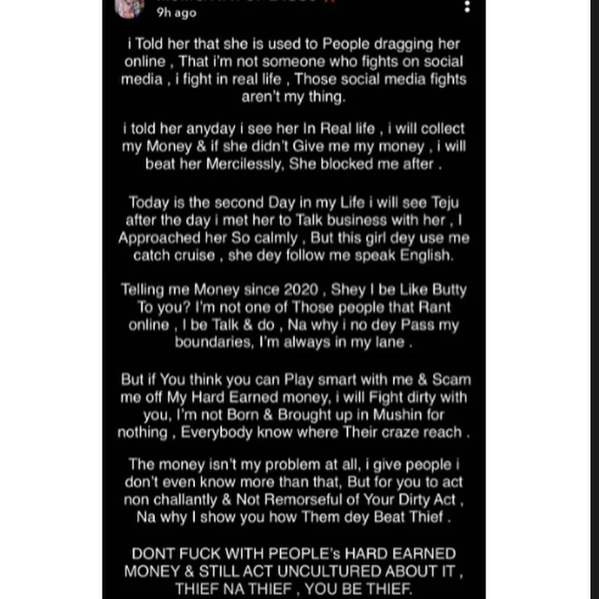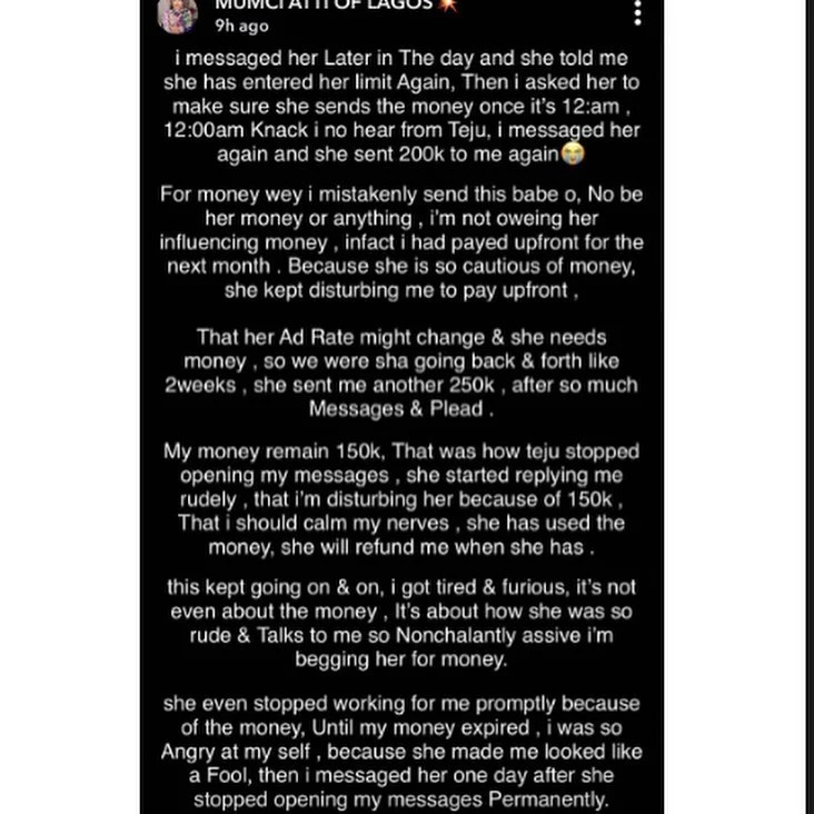 Till date, Teju allegedly refused to refund the balance of N150k even after she asked for it repeatedly, and became rude to her and berated her for ‘disturbing her peace’ because of N150k.