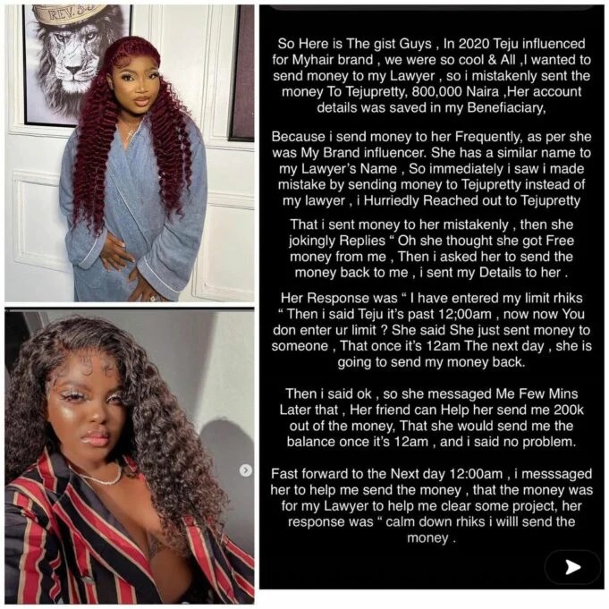 Rhiks, who used Snapchat to explain how the situation came to be, claimed that in 2020 she gave N800k to Teju by accident because Teju was an influencer for her company at the time.