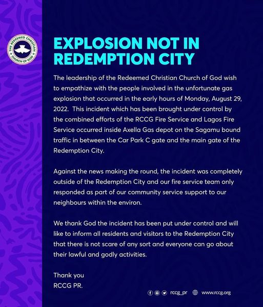 A statement released by RCCG Public Relations department reads; “against the news making the round, the incident was completely outside of the Redemption City and our fire service team only responded as part of our community service support to our neighbours within the environ”.