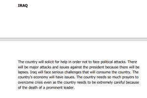 Also, An influential Shiite cleric announced he would resign from Iraqi politics, prompting hundreds of his angry followers to storm the government palace and sparking clashes with security forces in which at least five protesters were killed. While prophesying about Iraq,(Pg140) Primate Ayodele revealed that he foresaw a political crisis, this has been fulfilled.