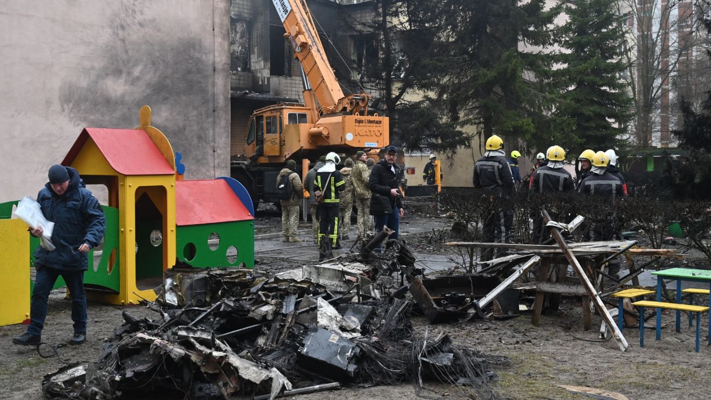 An emergency services helicopter crashed in Brovary, an eastern suburb of the Ukrainian capital. Nine people who died were aboard the helicopter.