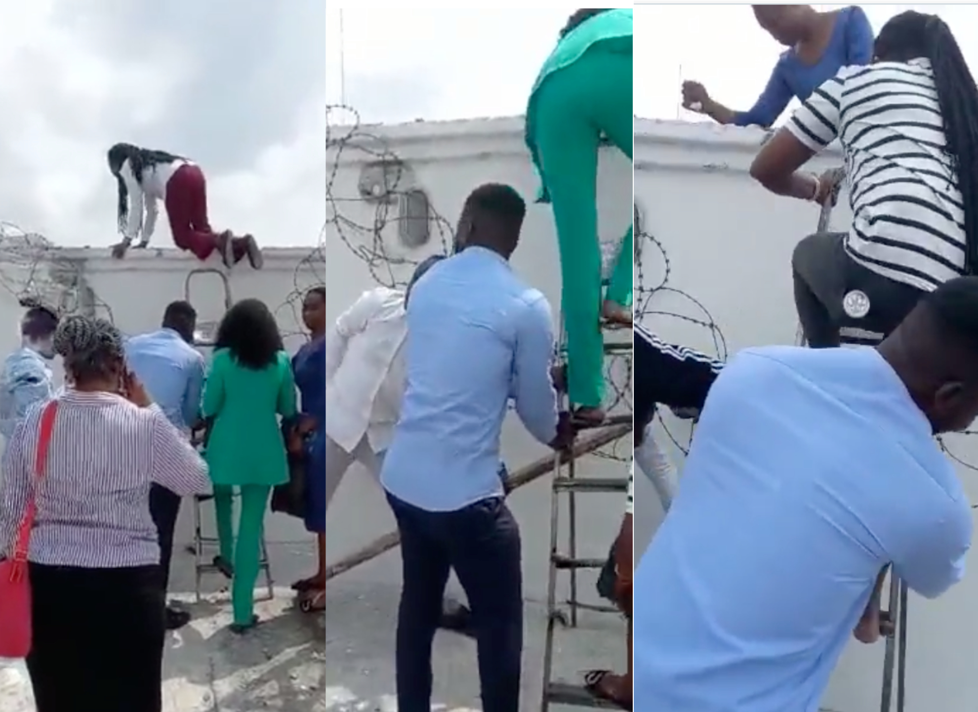 The bankers, who were making frantic efforts to flee with their belongings, are seen collaborating as they took turns using a ladder to climb up the fence and descend into a nearby bush.