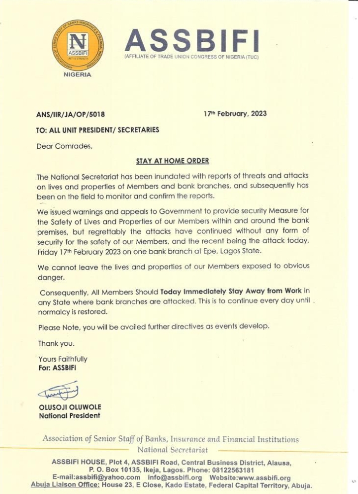 “We issued warnings and appeals to government to provide security measures for the safety of lives and properties of our members within and around the bank premises but regrettably the attacks have continued without any form of security for the safety of our members, and the recent being the attack today, Friday 17th February 2023 on one bank branch at Epe. Lagos State.