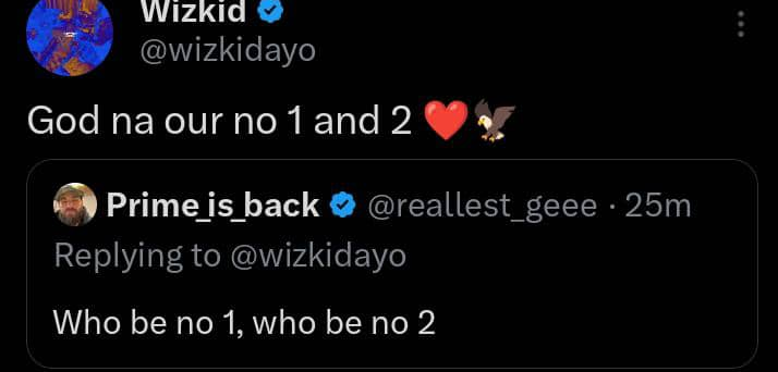 Wizkid replied: “God na our no 1 and 2 ❤️🦅 After God na God. No go whine 🦅”