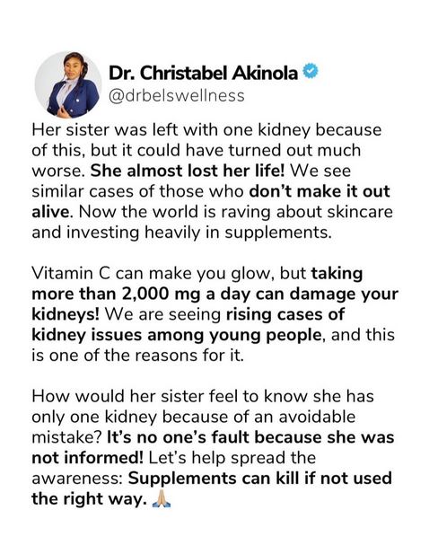 Doctors Warn Ladies About Vitamin C Supplements, Says “It Can Make You Glow, But Excess Can Damage Your Kidneys”