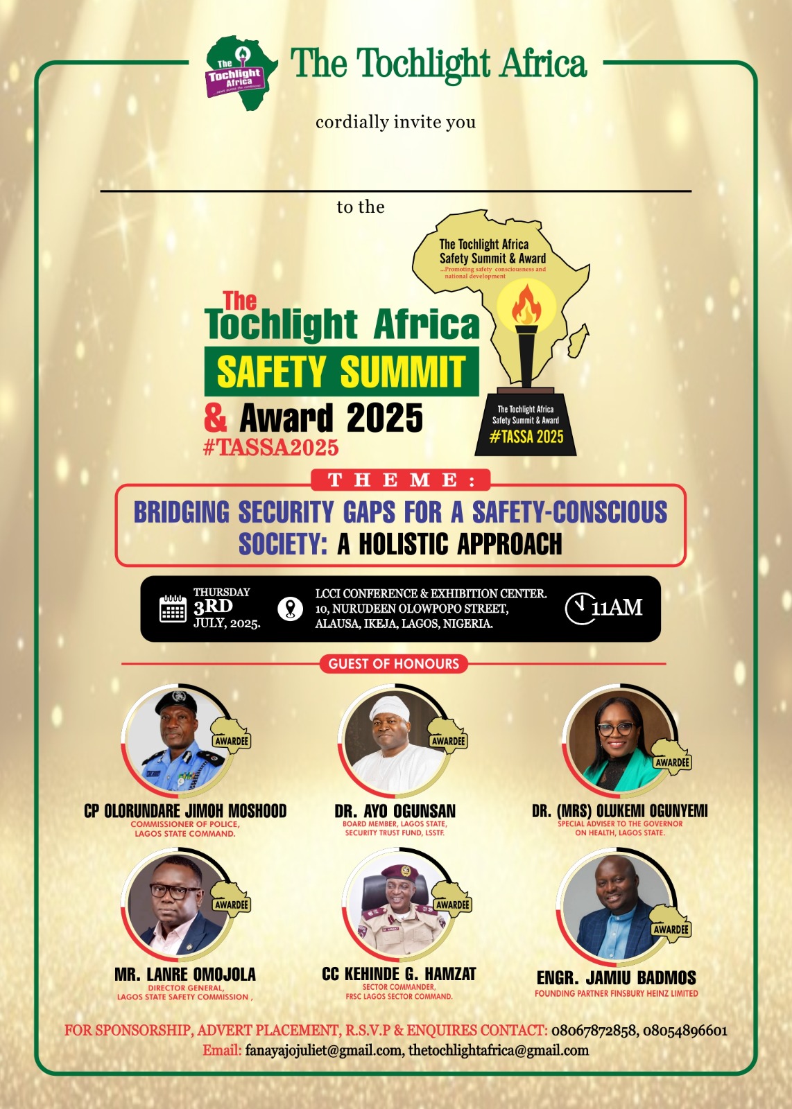 In a bold move to promote safety consciousness and drive national development through strategic security collaboration, TochLight Africa, a niche news platform addressing issues on safety and security, is set to hold its maiden edition of The Tochlight Africa Safety Summit and Award (TASS2025), scheduled to be held on Thursday, July 3rd, 2025, at the prestigious LCCI Conference & Exhibition Center, located at 10, Nurudeen Olowopopo Street, Alausa, Ikeja, Lagos.