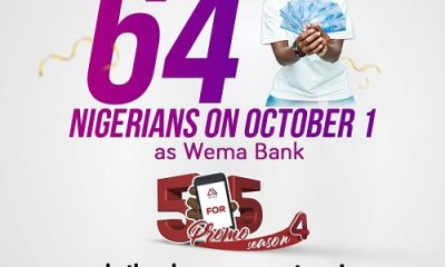 …To reward 64 customers with cash prizes in The Wema Bank 5 for 5 Promo Season 4 Independence Day Special Wema Bank, Nigeria’s foremost innovative bank...
